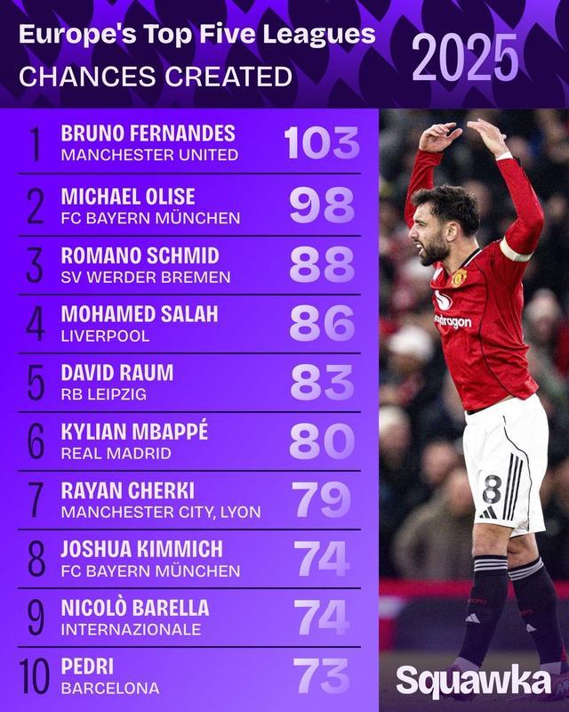 據(jù)統(tǒng)計,2025年歐洲五大聯(lián)賽“創(chuàng)造機會次數(shù)”排行榜出爐。曼聯(lián)中場布魯諾-費爾南德斯以103次強勢領跑,拜仁邊鋒奧利塞以98次位列第二。