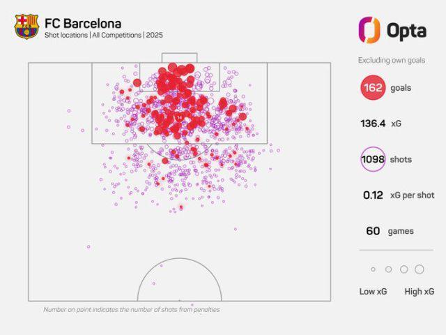2025年落幕在即,Opta統(tǒng)計,巴薩在年內(nèi)60場各線比賽之中打入169粒進球(烏龍球包含在內(nèi)),締造全新紀錄:單一自然年內(nèi),陣中既無梅西也無C羅的情況下,西甲球隊從未有過如此進球量??胺Q張局。